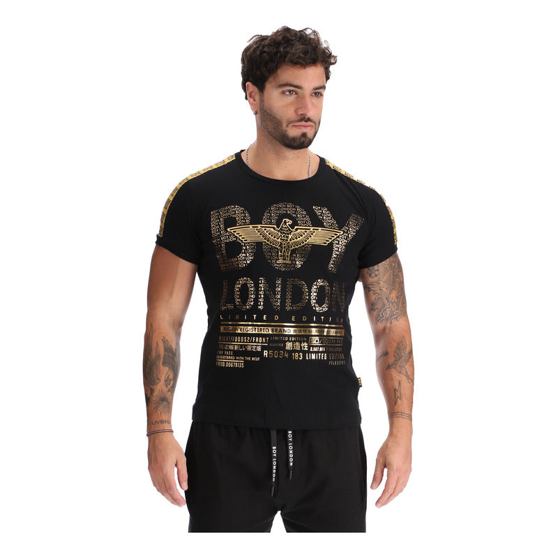 Playera Negra Hombre Letras Foil Dorado Estampado Boy London