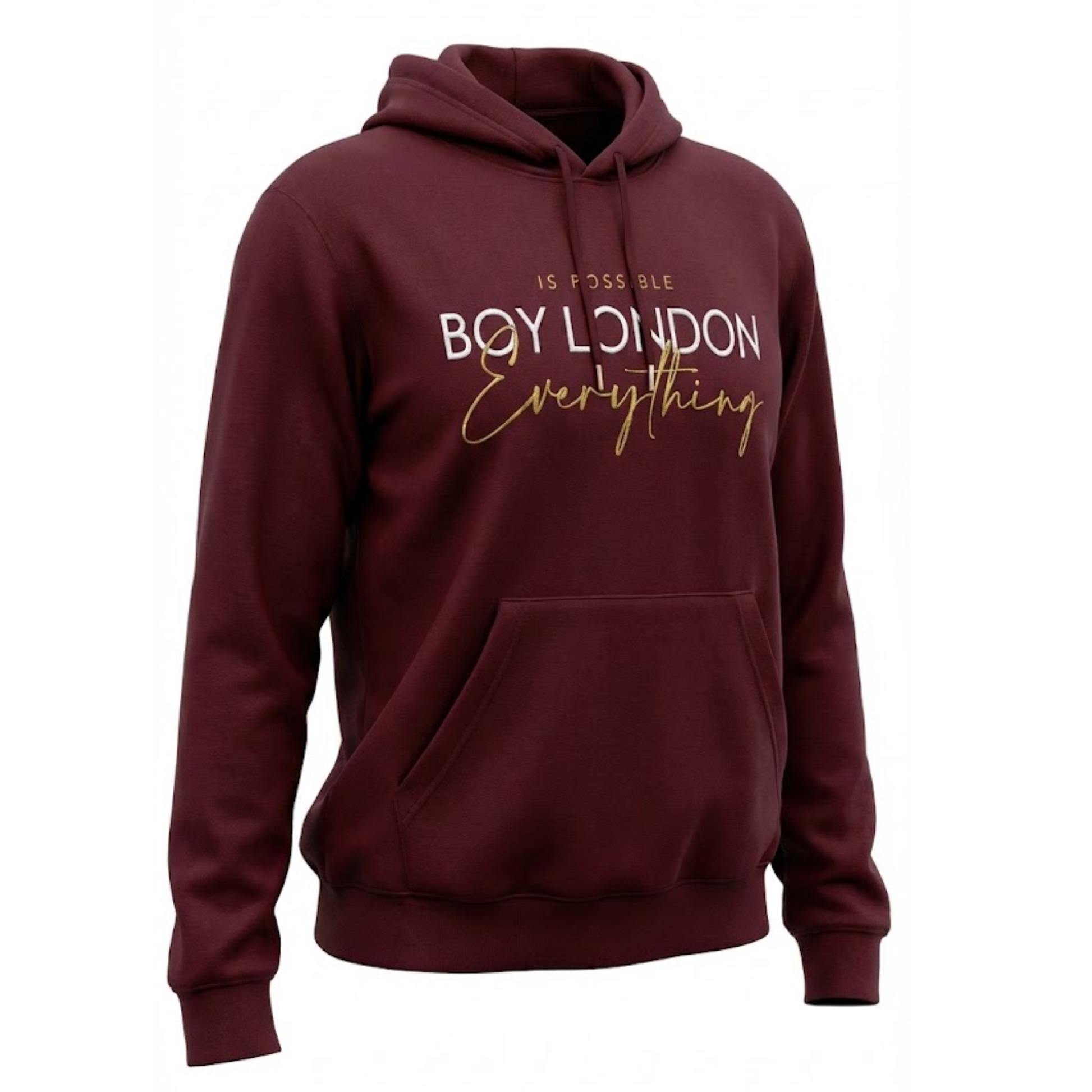 Sudadera con capucha y bolsillo tipo canguro, presenta el logo "BOY LONDON" en letras doradas y burdeos al frente, agregando un toque moderno y elegante.